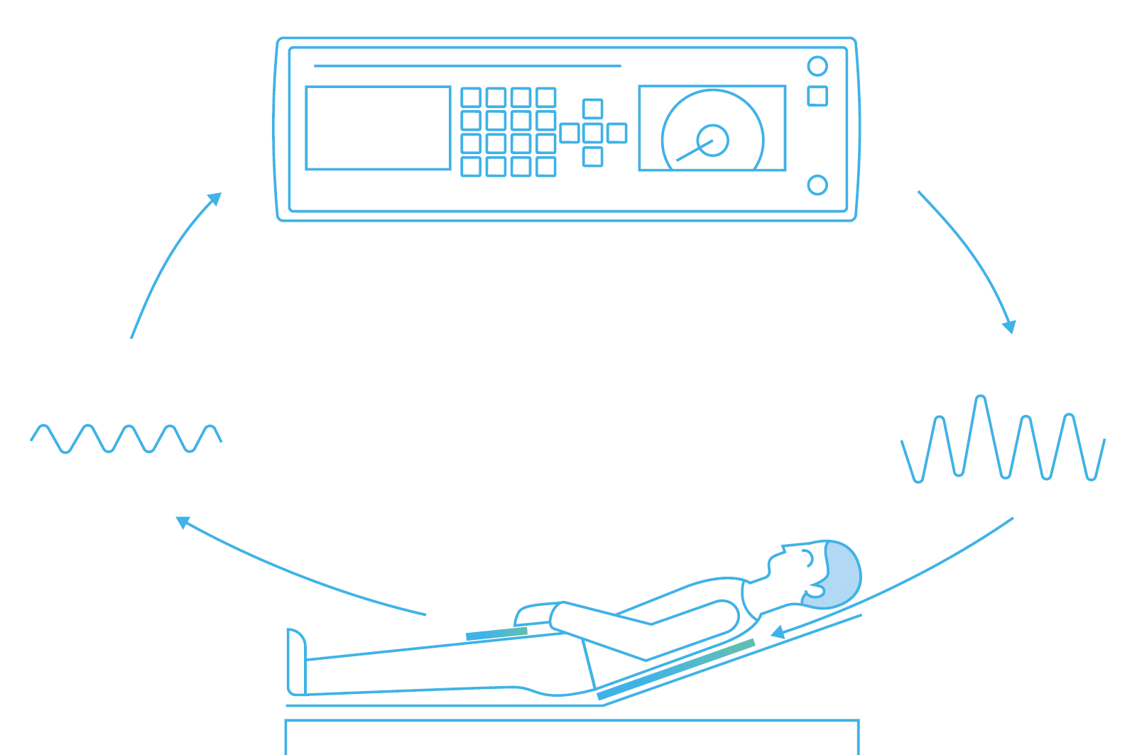 Vlastní frekvenční vzorky pacienta se snímají prostřednictvím vstupních elektrod. V přístroji jsou elektronicky modulovány do terapeutických frekvencí a těmi je pacient pomocí výstupní elektrody ošetřen. Při terapii se využívá zpětné vazby; pacient na vstupu je ovlivněn výstupním signálem, čímž se v průběhu terapie mění vstupní signál. Změna vstupního signálu nutně vyvolá změnu výstupního signálu. Tento princip je patrný z následujícího schematu: